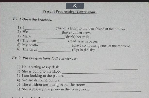 - Ответ: Ex.1. 1) I am writing 2) We are having 3) Mary is drinking 4) The man is readind 5) My brother is playing 6) The birds are flying Ex.2. 1) Is he sitting at my desk? 2) Is she going to the shop? 3) Am I looking at the picture? 4) Are we drinking our tea? 5) Are the children sitting in the classroom? 6) Is she playing the piano in the living room?