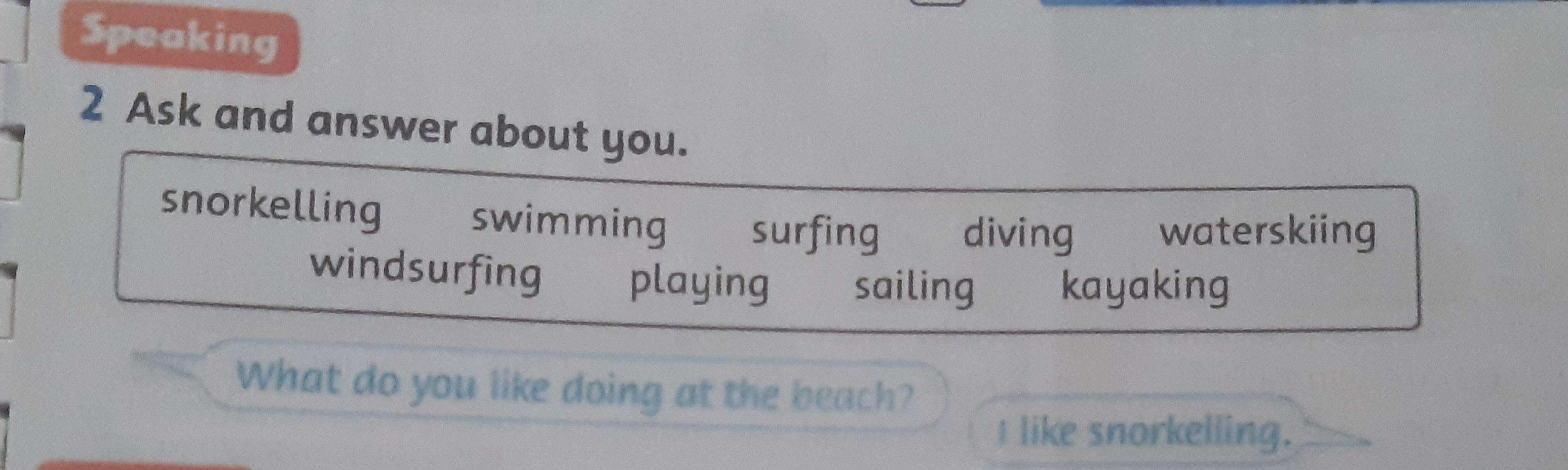 I like snorkelling, swimming, diving, playing and sailing. But I don't like to surfing, waterskiing, windsurfing or kayaking.