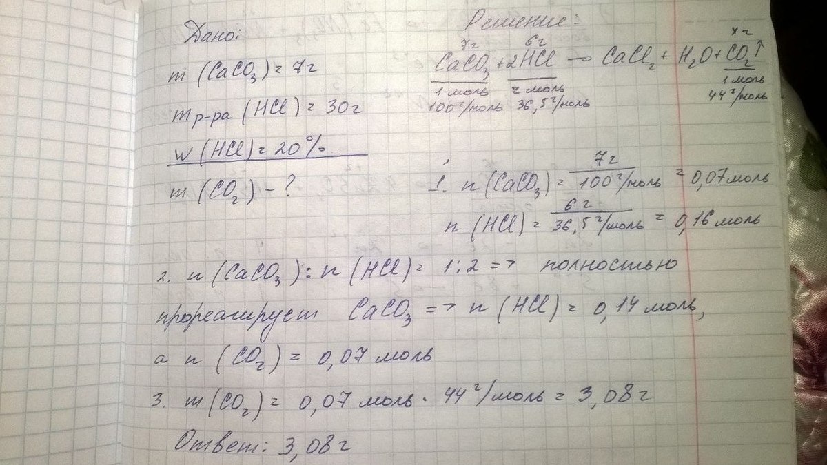 вычислите массу CO2,который можно добыть при взаимодействии CaCo3 массой 7г. из HCl массой 30г., массовая часть HCl в которой составляет 20%