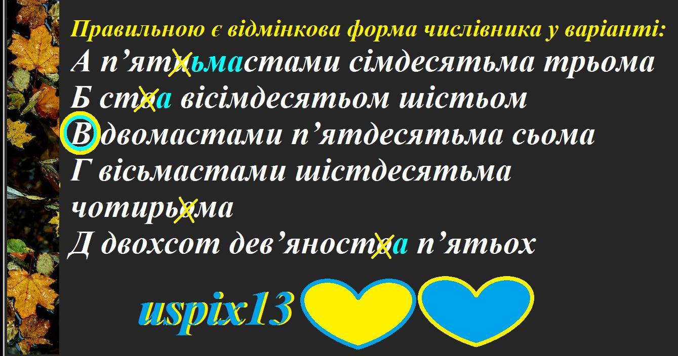 Правильною є відмінкова форма числівника у варіанті. Будь-ласка покажіть хід виконання (слова, які є зайвими)