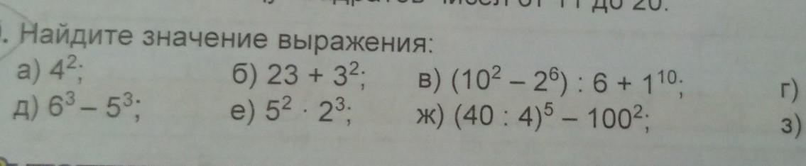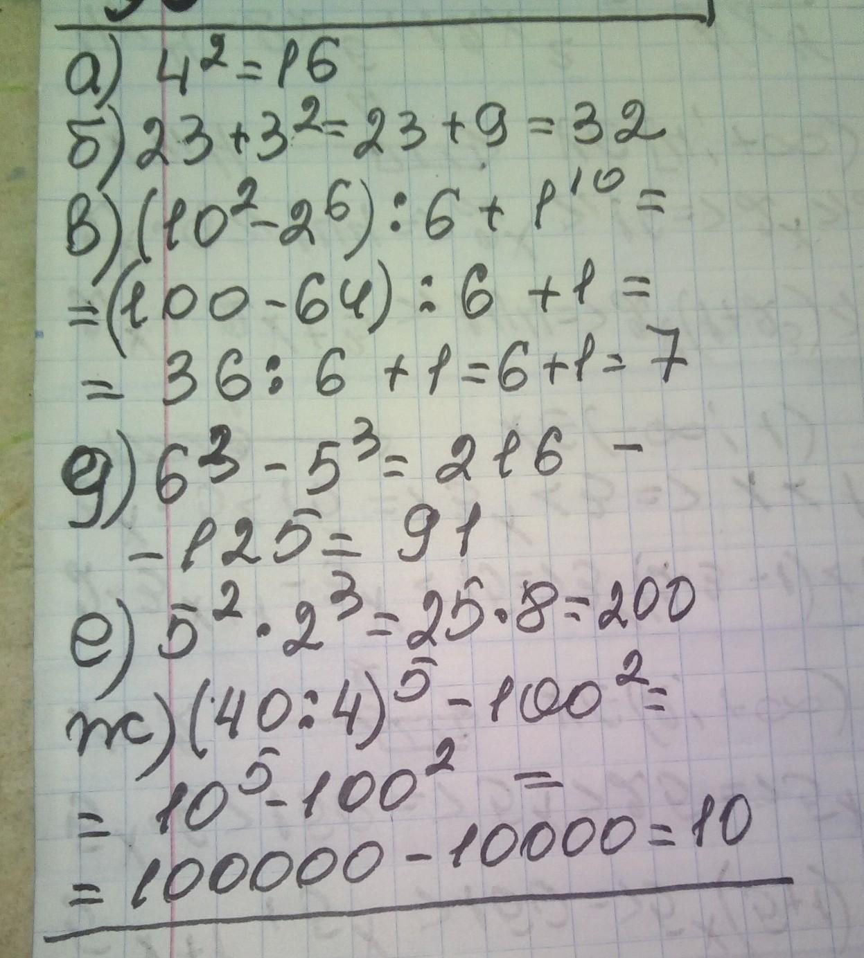 в) (10² - 2⁶) : 6 + 1¹⁰ = (100 - 64) : 6 + 1 = 36 : 6 + 1 = 6 + 1 = 7