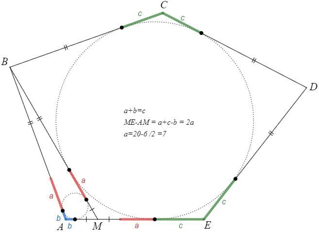 В пятиугольнике ABCDE стороны AB, BC, CD, DE равны. На стороне AE взята точка M так, что AM = 6.0, ME = 20.0. В треугольник ABM и пятиугольник MBCDE вписаны окружности. Найти расстояние между точками касания этих окружностей с отрезком BM. Запишите точный ответ в виде десятичной дроби.