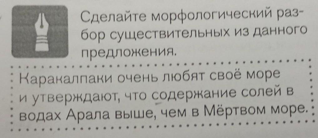 Сделайте морфологический раз- бор существительных из данного предложения. Каракалпаки очень любят своё море и утверждают, что содержание солей в водах Арала выше, чем в Мёртвом море. помогите даю40