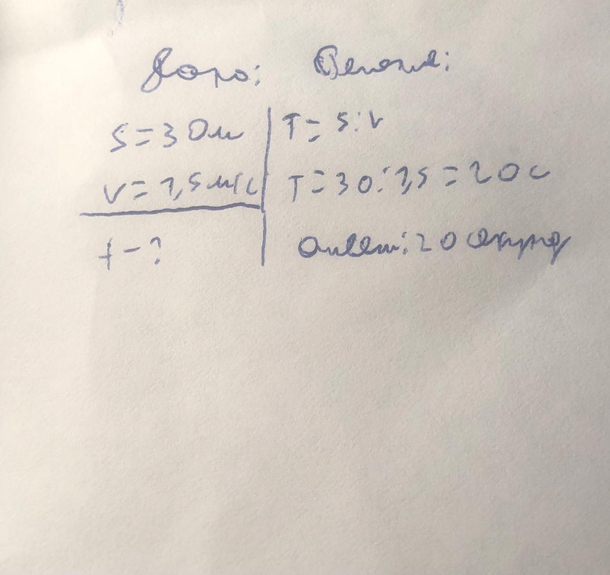 Знайдіть час руху хлопчика, якщо він пройшов 30 м зі швидкістю 1,5 м/с Будьласка, можна з розв'язанням?╮(^▽^)╭