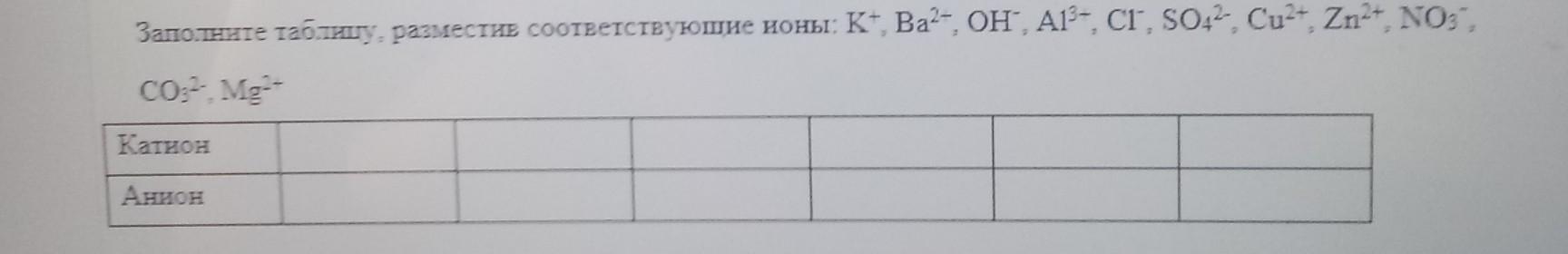 СРОЧНОООО ПОМОГИИИТЕЕЕЕ ПО СОЧУУУ ПО ХИМИИИ!!!!Заполните таблицу, разместив соответствующие ионы: K^+, Ba^2+, OH^-, AI ^3+, CI^-, SO4²-, Cu ^²+, Zn ^²+, NO3^-, CO3^²-, Mg^²+