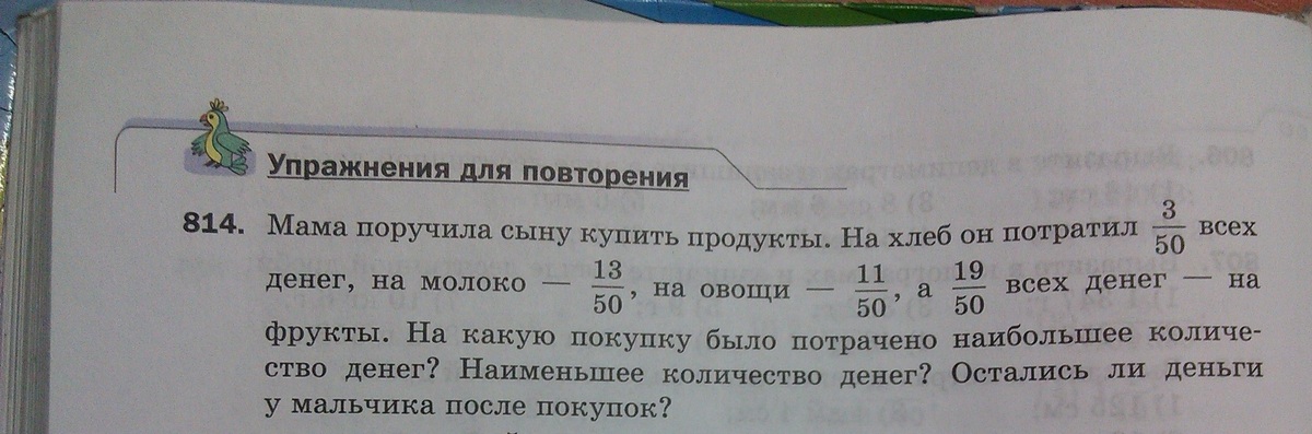 самая маленькая дробь 3/50 значит на хлеб потратил меньше всего. самая большая дробь 19/50 на фрукты. всего потратил 46/50 (сложили все), значит осталось 4/50 всех денег