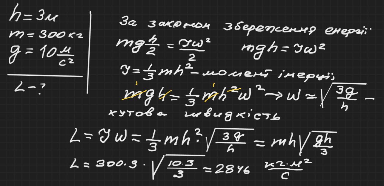 Стовп висотою h=3 м і масою 300 кг з вертикального положення падає на землю. Визначити момент кількості руху стовпа L відносно точки опори.