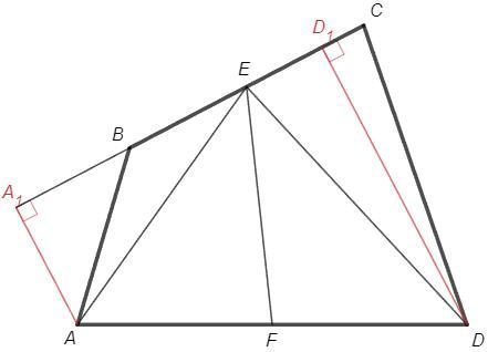 В треугольниках AEF и DEF равные основания и общая высота из вершины E - треугольники равновеликие. Тогда из условия следует, что треугольники BAE и CDE также равновеликие. Основания этих треугольников равны, следовательно равны и их высоты: