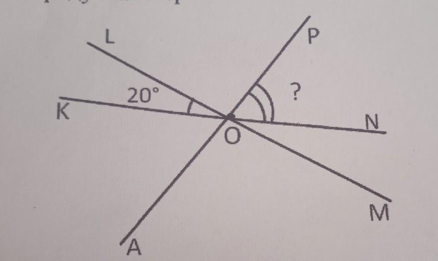 Так як AP перпендикулярна прямій LM, то кут POM = 90 градусів. Кути LOK i MON вертикальні, тому рівні між собою і дорівнюють 20 градусів. Тому кут PON = POM-MON=90-20=70