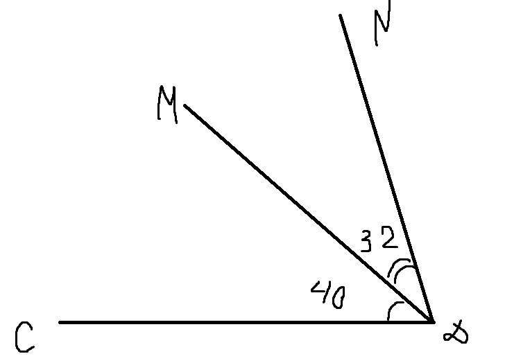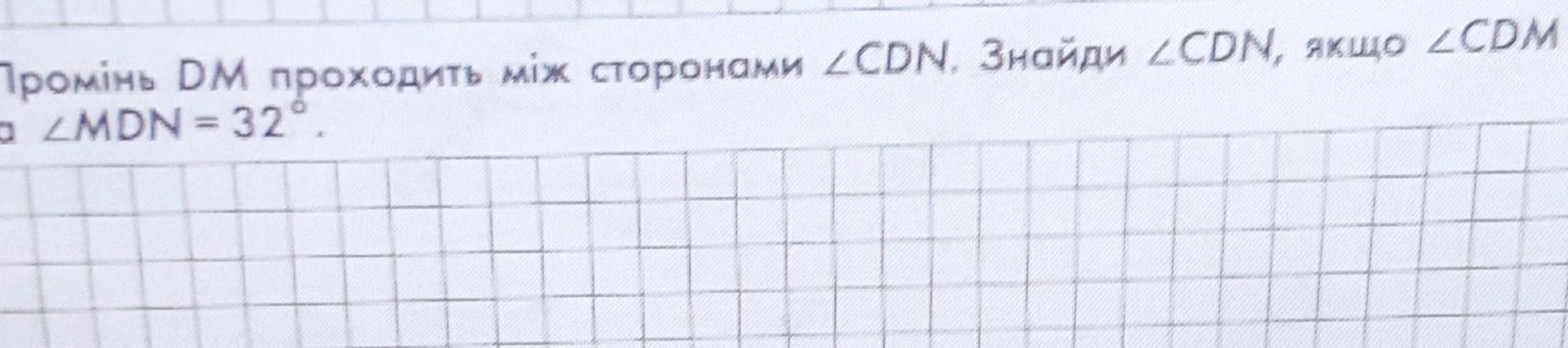 Промінь DM проходить між сторонами кута CDN. Знайди кут CDN,якщо кут CDM = 40°, а кут MDN = 32°. Потрібний малюнок і розв'язання
