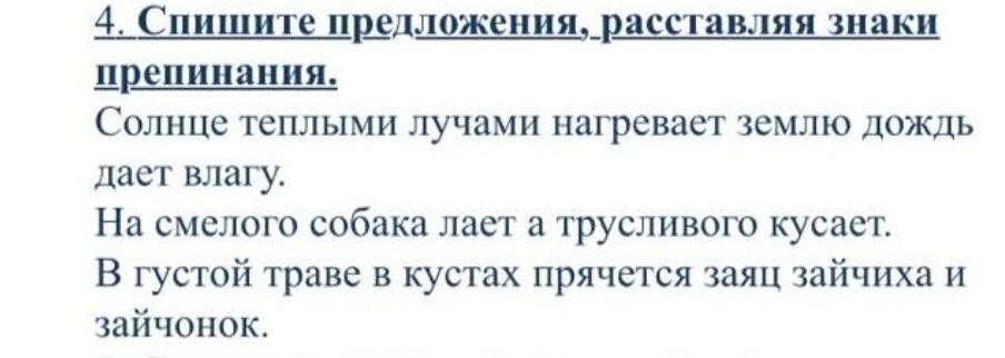 4. Спишите предложения, расставляя знаки препинания. Солнце теплыми лучами нагревает землю дождь дает влагу. На смелого собака лает а трусливого кусает. в густой траве в кустах прячется заяц зайчиха и зайчонок.