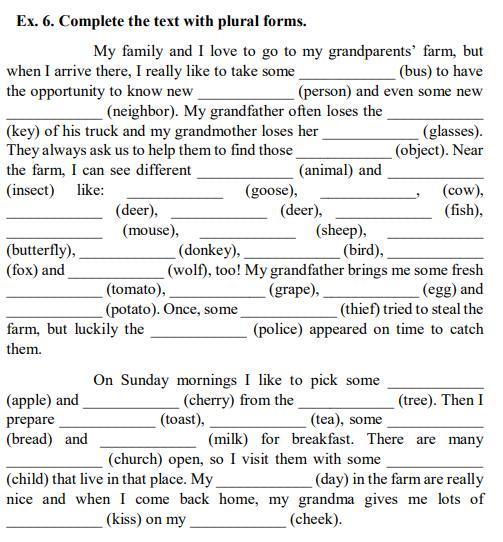 buses. people. neighborhood. keys, glasses. objects. animals. insects. geese. cows. deer. deer. fish. mice. sheep. butterflies. donkeys. birds. foxes. wolves. tomatoes. grapes. egg. potatoes. thieves. police. apples. cherries. trees. toasts. teas. breads . milks. churches . children . days, kisses. cheeks