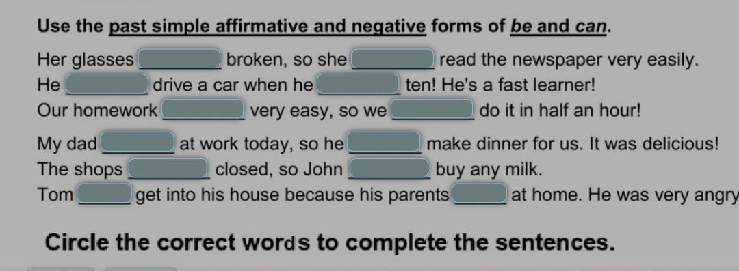 Use the past simple affirmative and negative forms of be and can. Her glasses broken, so she He Our homework My dad The shops Tom drive a car when he very easy, so we read the newspaper very easily. ten! He's a fast learner! at work today, so he closed, so John get into his house because his parents do it in half an hour! make dinner for us. It was delicious! buy any milk. at home. He was very angry!
