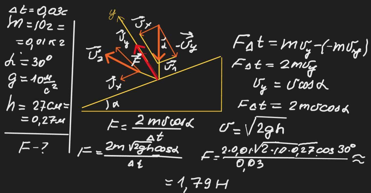 Стальна кулька масою 10 г падає на стальну площину, нахилену під кутом 30 градусів до горизонту. Знайти середню силу удару, якщо кулька падає з висоти 27 см, а час удару 0,03с. Удар пружний.