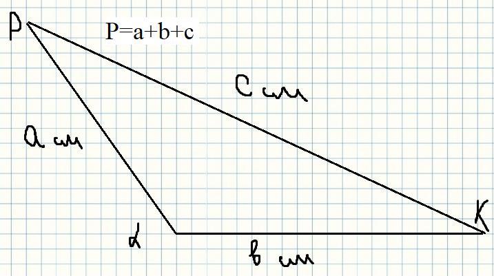 Визначити довжину сторін в онлайн редакторі можливості немає, тому ці числа позначенні літерами, коли перемаляюєте малюнок за допомогою лінійки відміряйте довжину з однієї вершини до двох сусідніх. Периметр це сума всіх сторін. Отже щоб визначити його вам потрібно додати три значення (довжина кожної з трьох сторін)