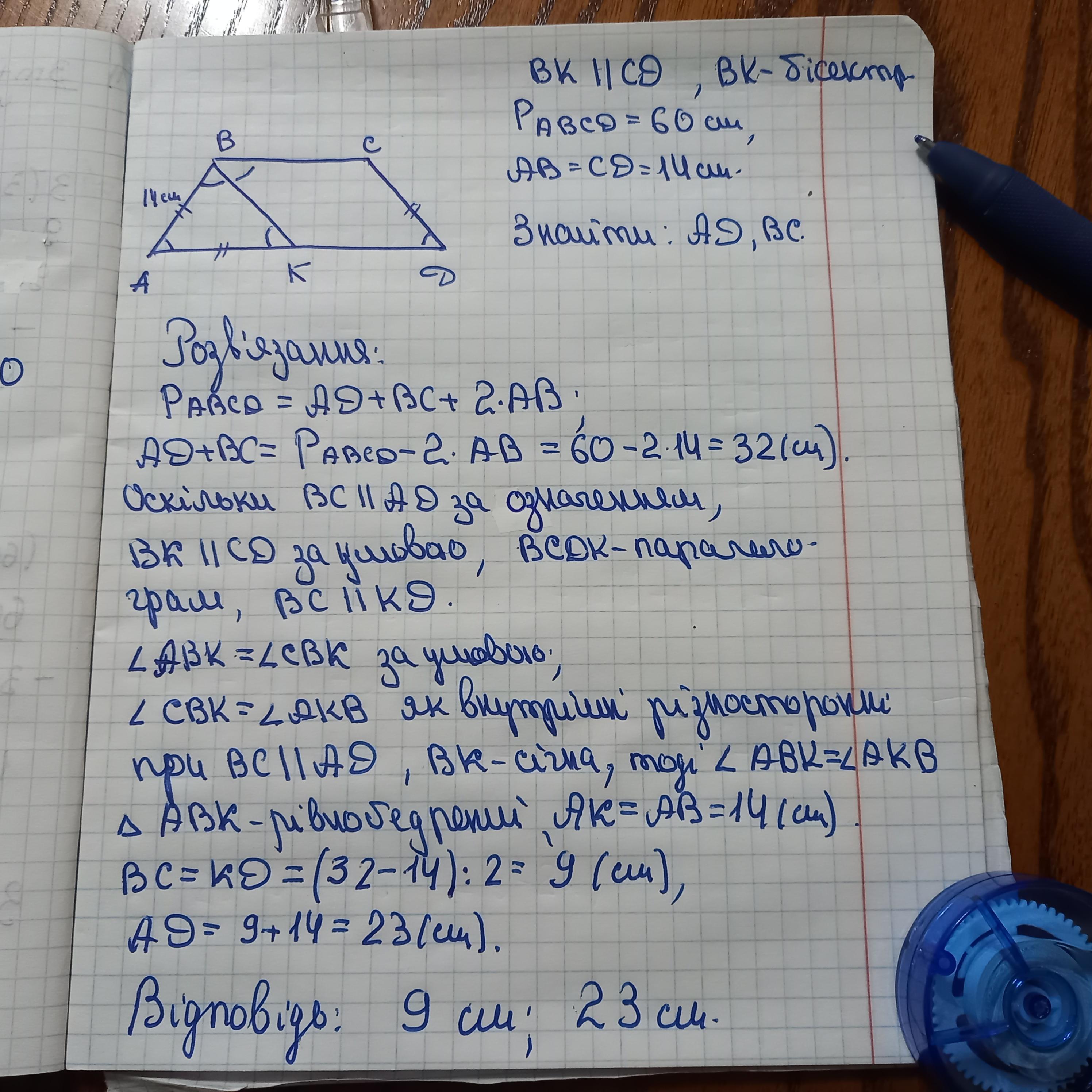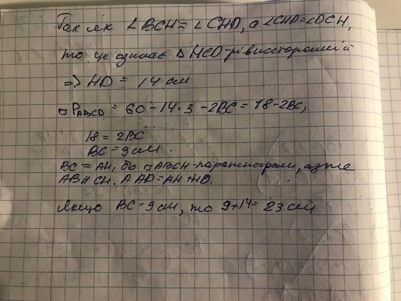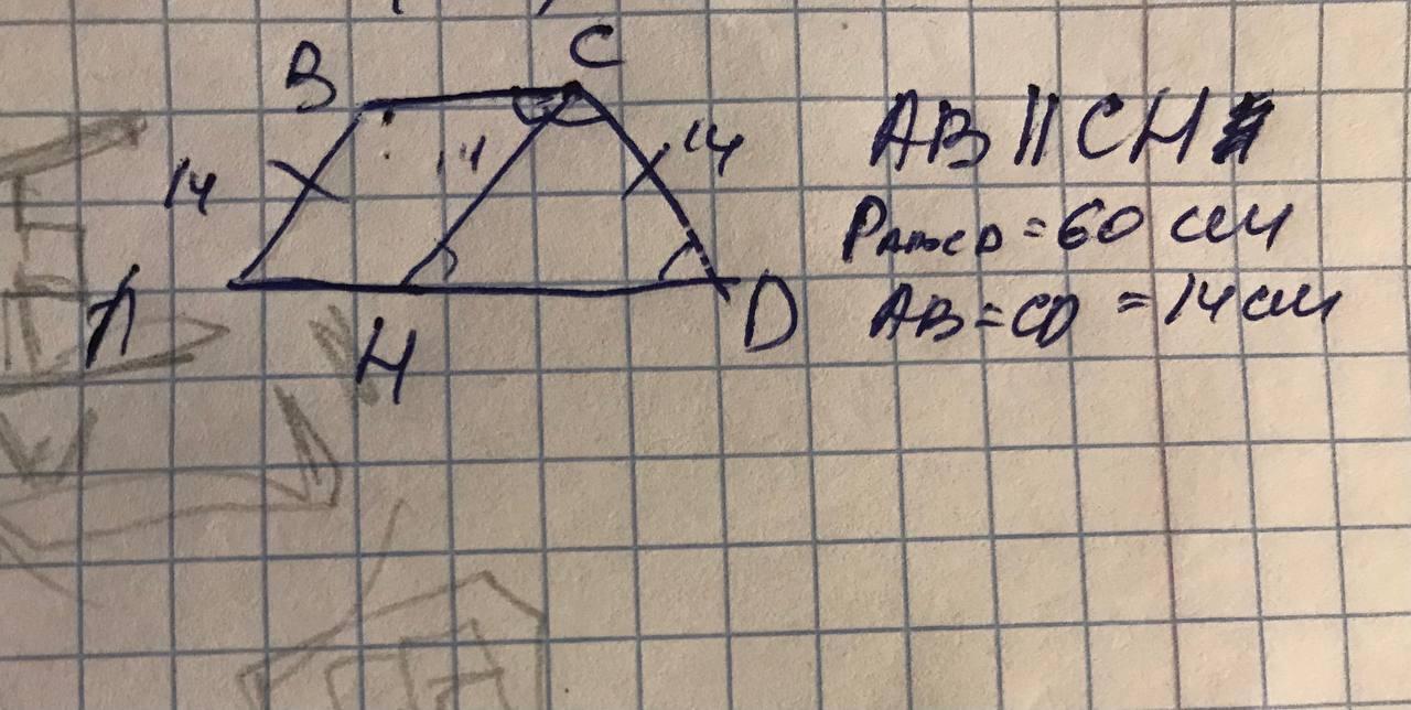 У рівнобічній трапеції бісектриса тупого кута паралельна бічній стороні знайдіть основи трапеції якщо її перимитр дорівнює 60 см а бічна сторона 14 см