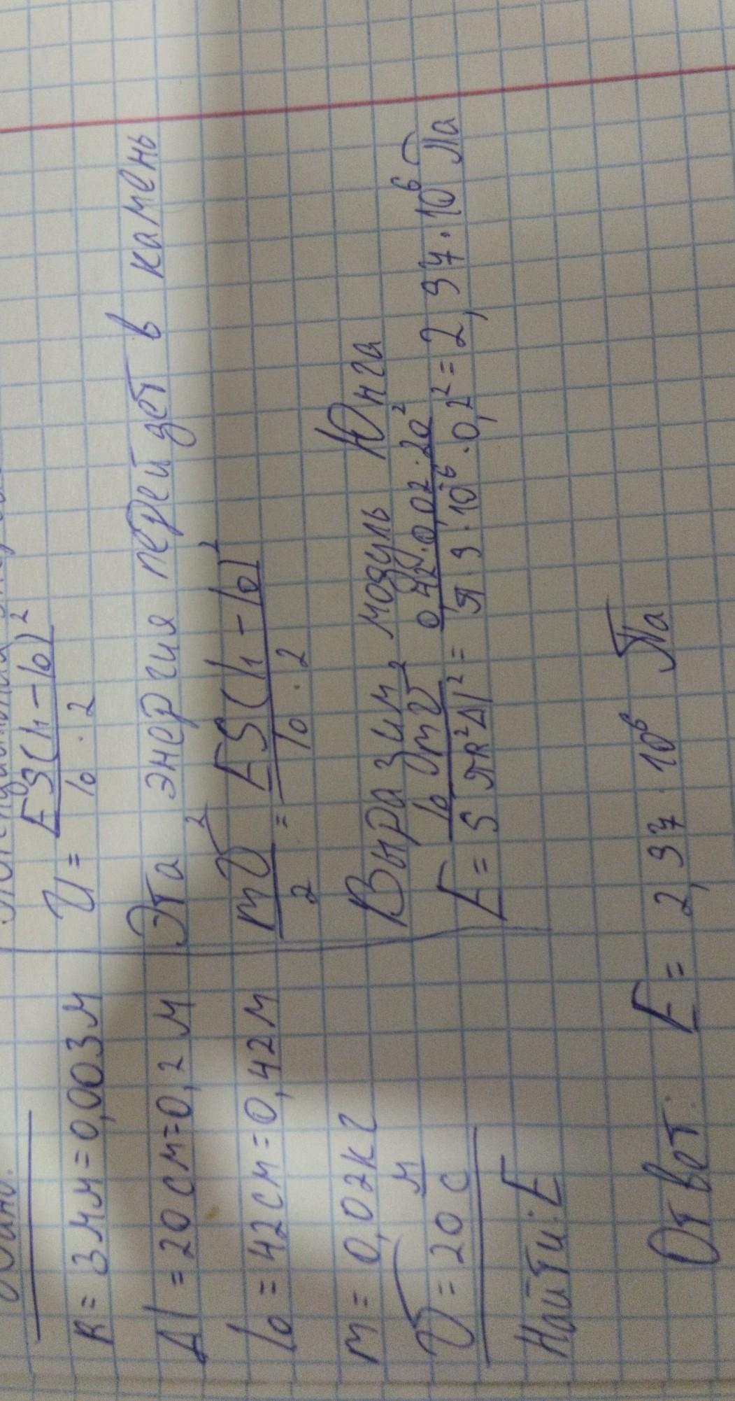 Вовка в тридевятом царстве решил похулиганить, и сделал из хвоста ослика Иа и случайной палки рогатку. Хвост был длиной 42 сантиметра, а радиус хвоста был 3мм. Вовка, стреляя из рогатки, растянул хвост на 20 см. Найти, чему равен модуль Юнга для этой резины, если известно, что камень, массой 0.02кг полетел со скоростью 20 м/с. Изменением сечения хвоста при растяжении пренебречь