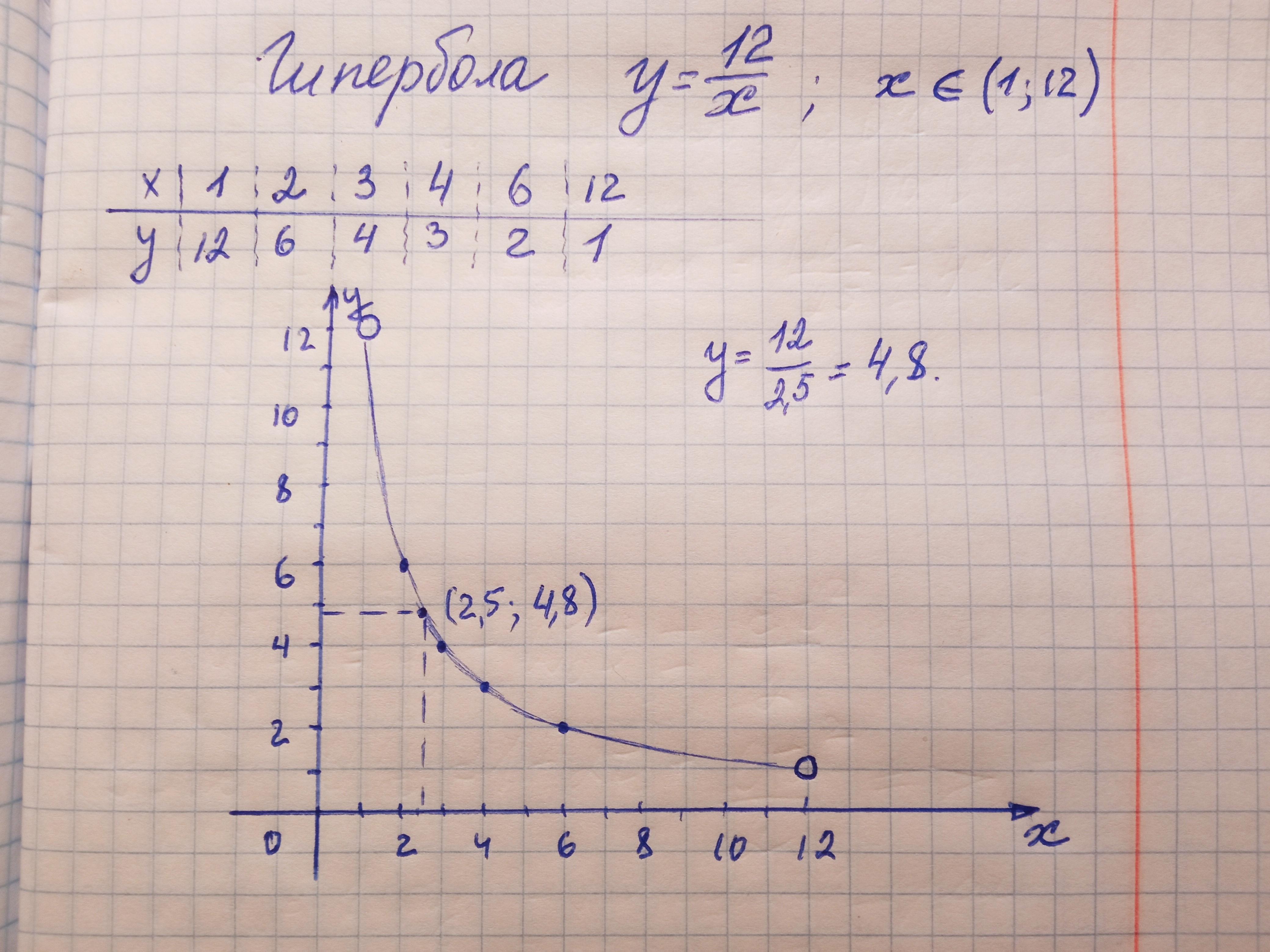 Функция задана формулой y=¹²/x, где 1 ‹ x ‹ 12. Составьте таблицу значений функции для целых значений x. Постройте график функции. Отметьте на графике точку с абсциссой 2,5. Найдите её ординату и проверьте результат по формуле.