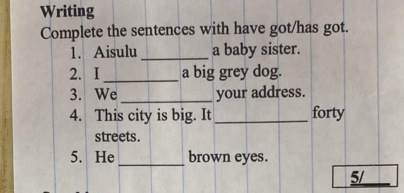 Writing Complete the sentences with have got/has got. 1. Aisulu a baby sister. a big grey dog. 2. I 3. We 4. This city is big. It streets. 5. He your address. brown eyes. forty 5/
