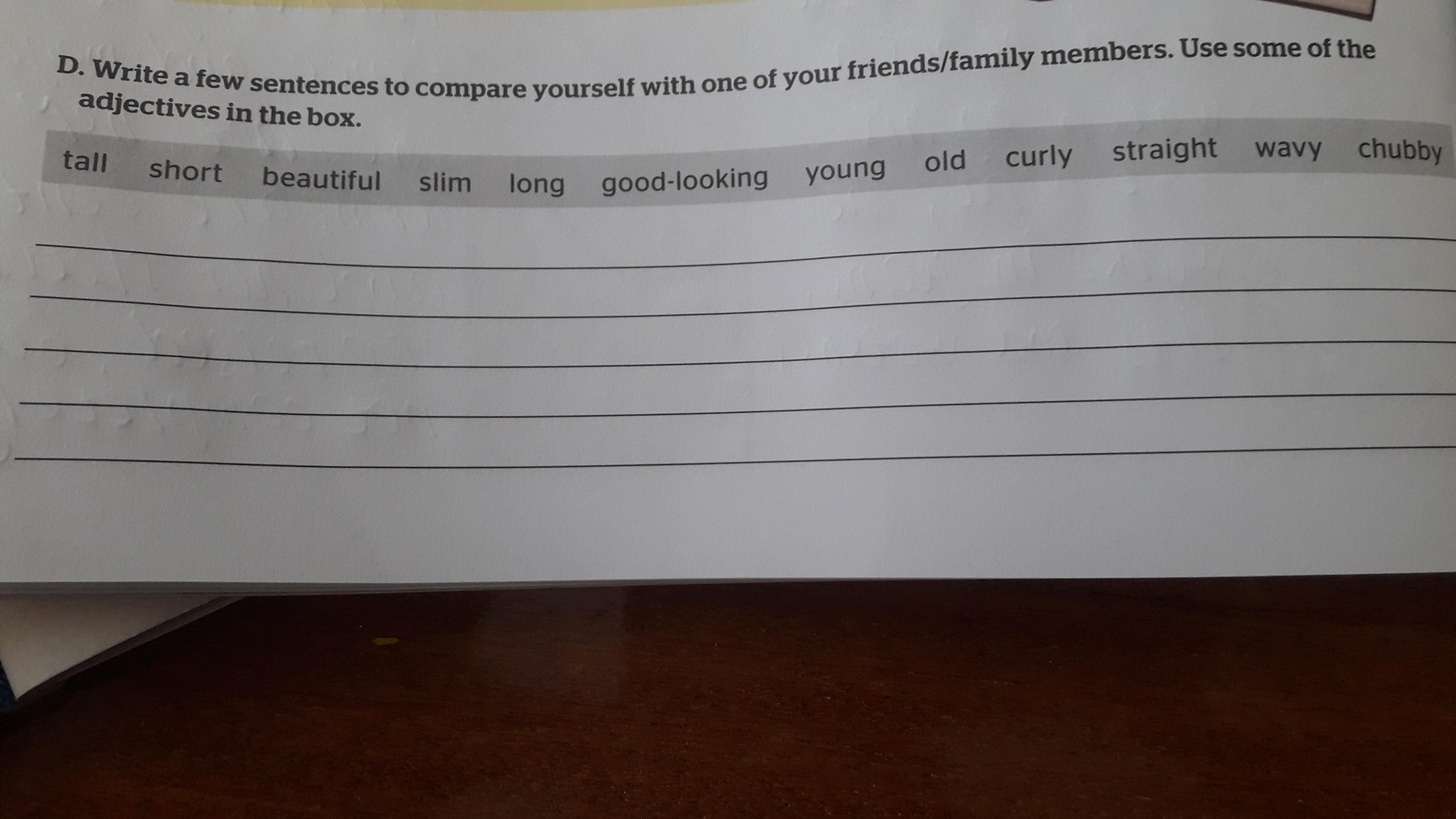 My mom is yong. My sister has curly and long hair. My dad is tall. My granny is beautiful. My friend Saida looking-good today. I am a slim and short. My grandfather has straight hair and chubby face.