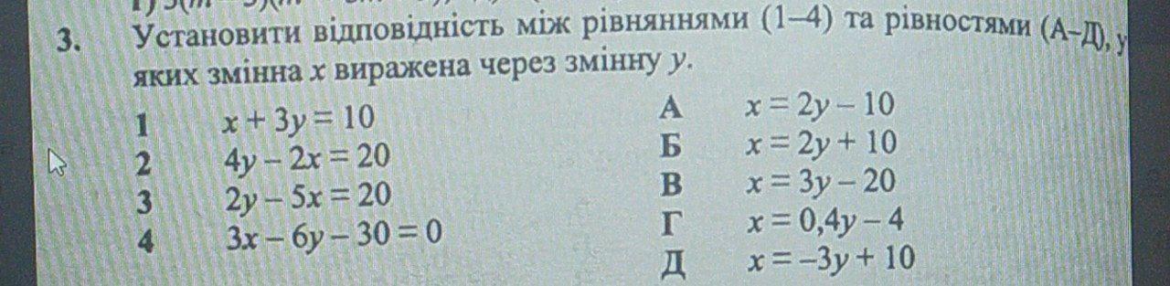 Установити відповідність між рівняннями 1-4 та рівностями (А-Д) у яких зміна x виражена через зміну y