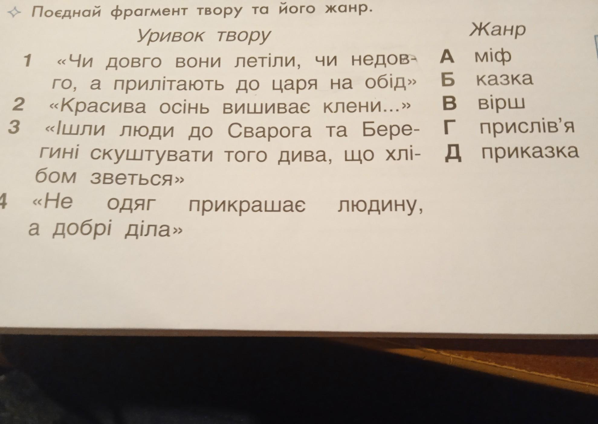 Уривок твору 1 «Чи довго вони летіли, чи недов- го, а прилітають до царя на обід» «Красива осінь вишиває клени…» «Ішли люди до Сварога та Бере- гині скуштувати того дива, що хлі- бом зветься» ОДЯГ «He а добрі діла» 2 3 прикрашає людину, Жанр А міф казка Б В вірш Г прислів'я Д приказка