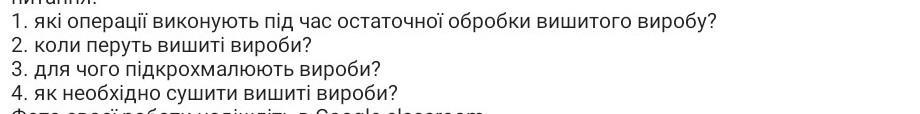 1.Остаточна обробка вишитого виробу включає прання й прасування. Ці операції варто проводити дуже обережно, щоб не зіпсувати вишивку.