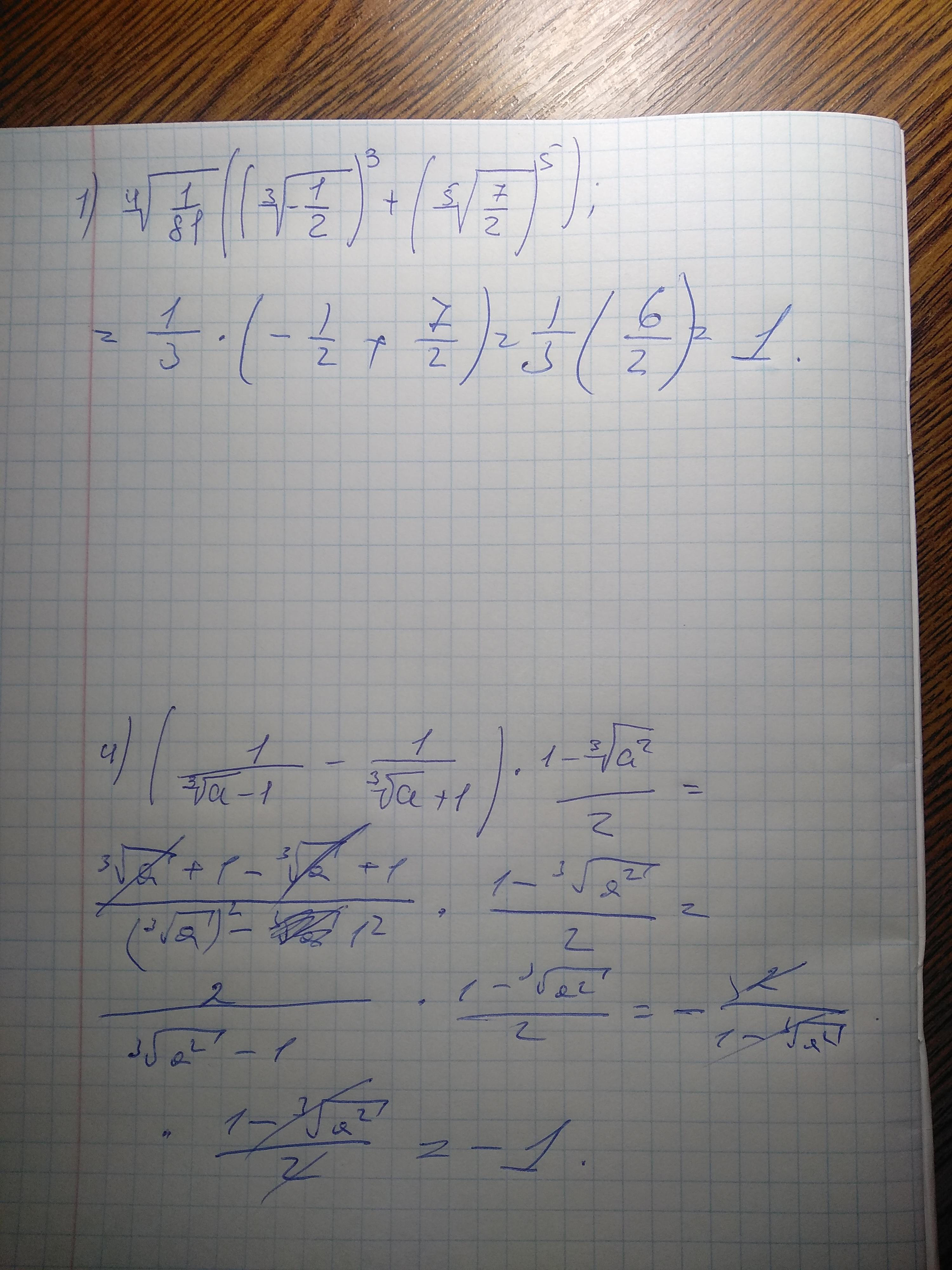 4) [(³√а +1- ³√а +1)/((³√а -1)*(³√а +1))]*[((1- ³√а)*(1+ ³√а))/2]=[(³√а +1- ³√а +1)/((³√а -1)*(³√а +1))]*[(-(³√а-1)*1)/2]=[2/(³√а -1)]*[(-(³√а-1)*1)/2]=-1