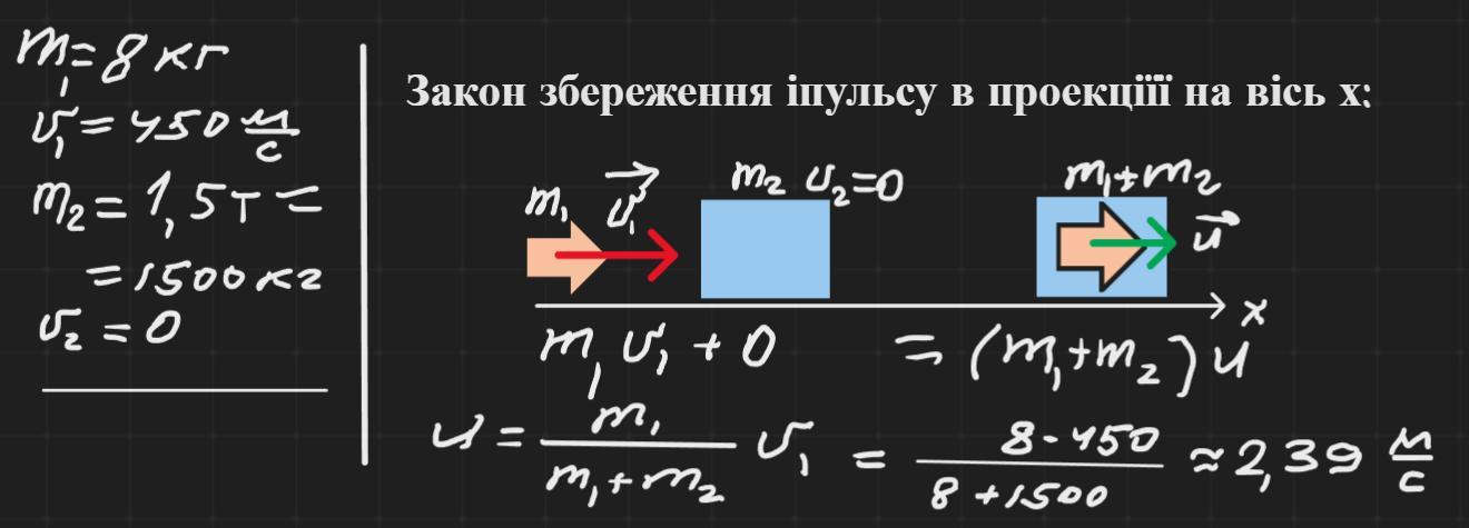 Снаряд масою 8 кг, що летить паралельно рейкам з швидкістю 450 м/с, ударяється в нерухому платформу з піском, маса якої 1,5 т, і застряє в ній. З якою швидкістю почне рухатись платформа?