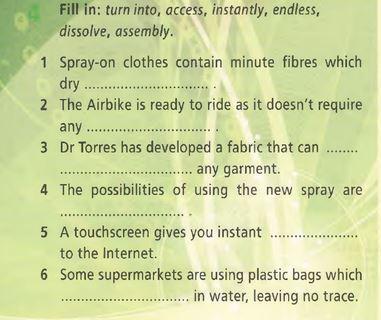 1 10.3.7] Fill in: turn into, graphics, endless, dissolve, assembly. 1 The Airbike is ready to ride as it doesn't requir any .... 2 Dr Torres has developed a fabric that can .... ................ any garment. The possibilities of using the new spray The high-resolution