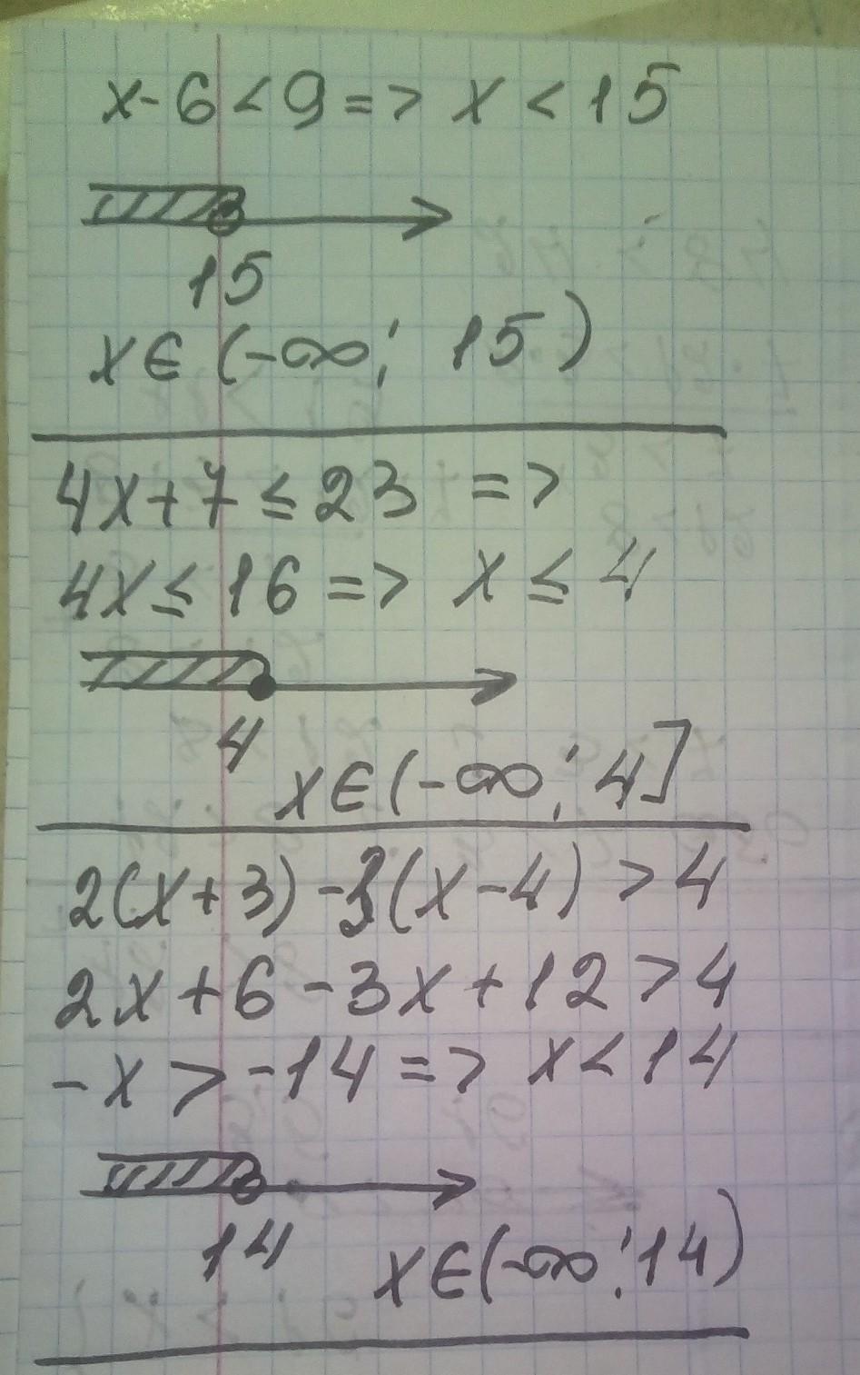 а) x ─ 6 < 9; б) 4x + 7 ≤ 23; в) 2(х+3)-3(х-4)>4.