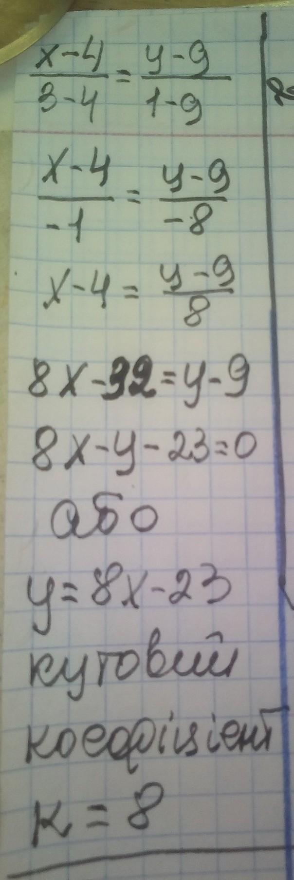 Скласти рівняння прямої, що проходить через точки А ( 4; 9 ) і В ( 3; 1 ). Знайти її кутовий коефіцієнт.