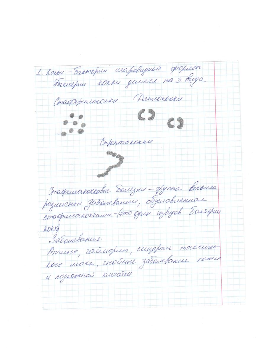1) Рассмотрите рисунки бактериальных клеток и найдите на них клетки круглой формы - кокки. Нарисуйте их в тетрадь. Запишите примеры заболеваний, которые могут вызвать эти бактеии.
