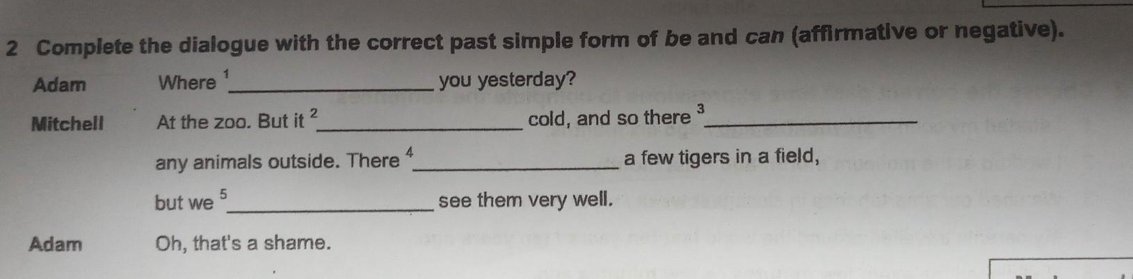 2 Complete the dialogue with the correct past simple form of be and can (affirmative or negative). 1 Adam you yesterday? Mitchell Adam Where At the zoo. But it ² any animals outside. There 4 5 but we Oh, that's a shame. cold, and so see them very well. there 3 a few tigers in a field, Mark: 15