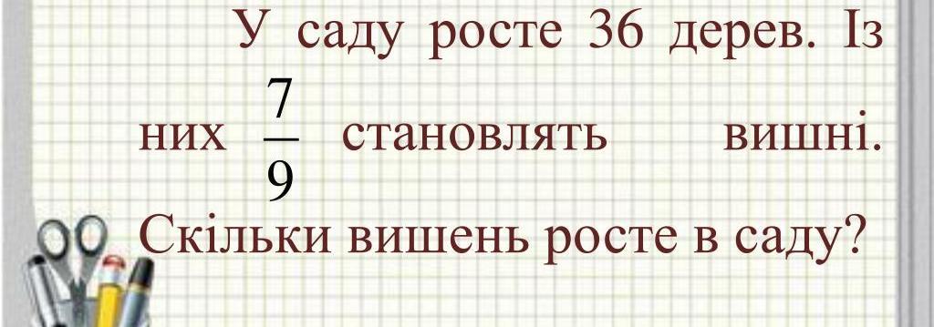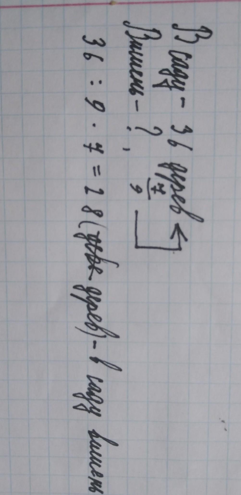 Нужно найти 7/9 от 36. То есть, 7/9 * 36 = 7 * 4 = 28 вишен росло в саду. (P.S. 7/9 ≈ 78% всего сада).