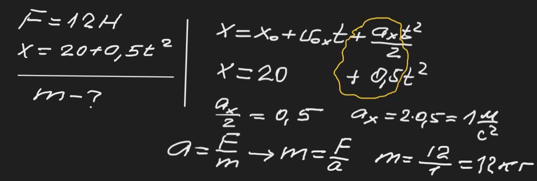 Під дією сили 12H тiло рухаються прямолінійно так, що рiвняння його руху має вигляд: х= 20+0,5 t². Знайти масу рухомого тіла. ОЧЕНЬ НАДО! С решением можна подалуйста. Даю 50 балов!!!