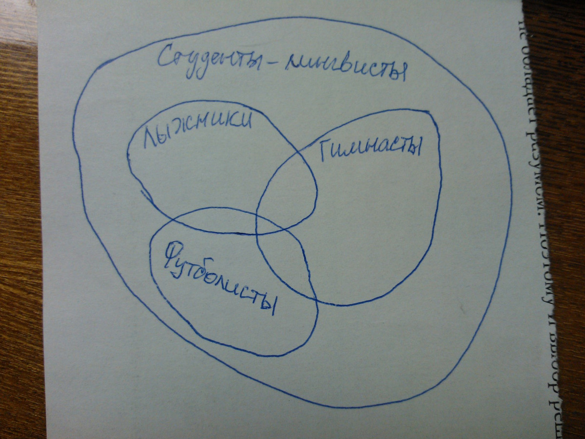Если предполагать, что каждый студент-лингвист может либо не заниматься спортом, либо заниматься одним или несколькими видами спорта, то диаграмма будет выглядеть следующим образом: