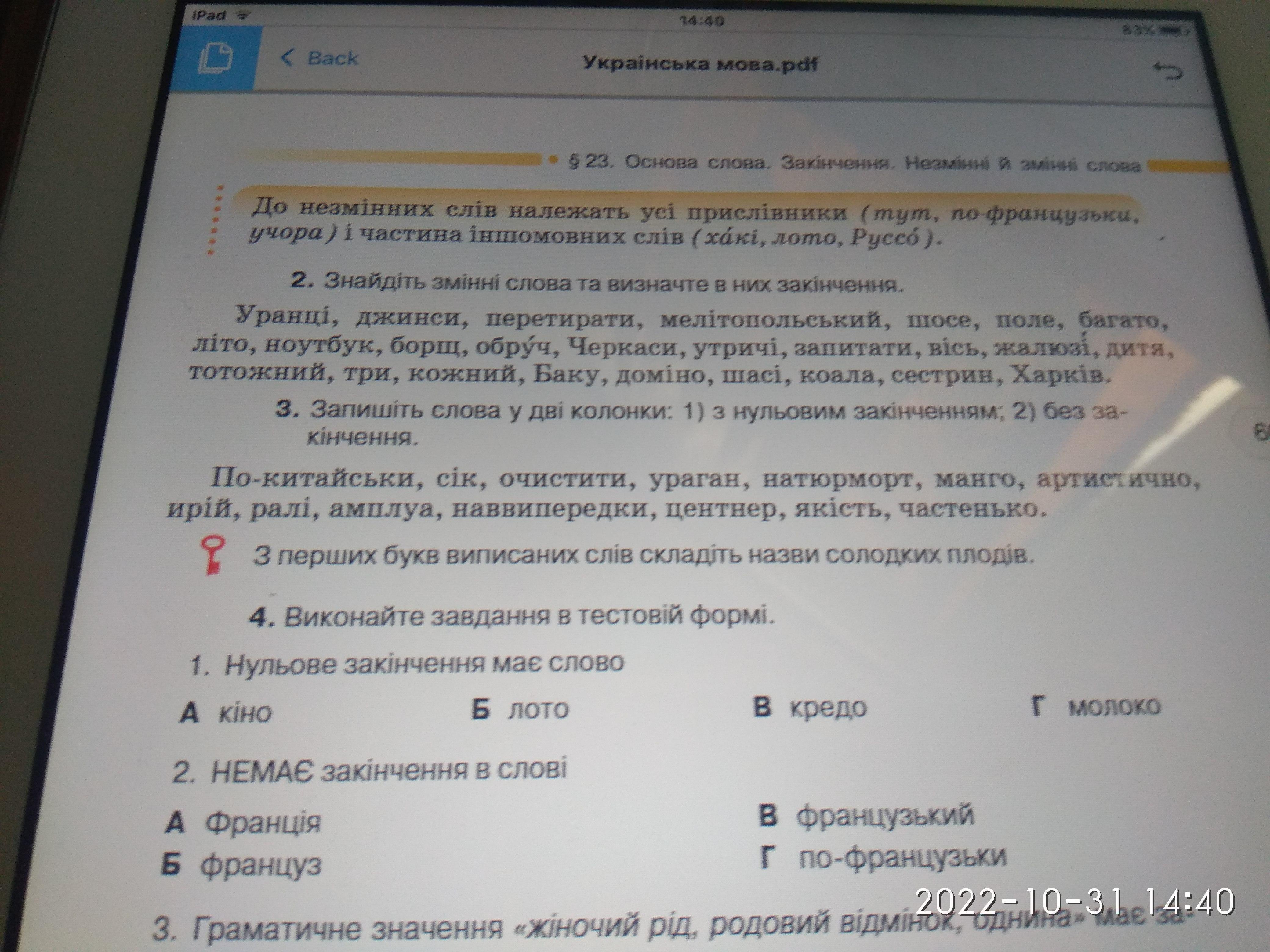 2)без закінчення: по-китайськи,очистити,манго, аристократично,ралі,амплуа,наввипередки, частенько
