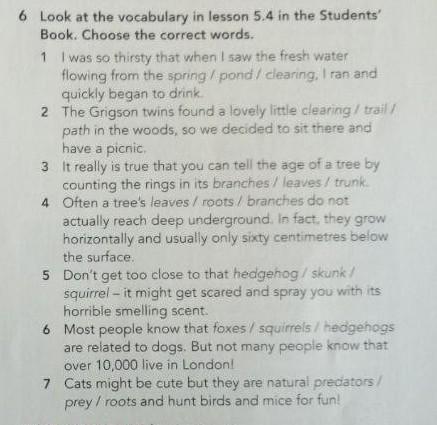 6 Look at the vocabulary in lesson 5.4 in the Students' Book. Choose the correct words. 1 I was so thirsty that when I saw the fresh water flowing from the spring /pond/ clearing, I ran and quickly began to drink. 2 The Grigson twins found a lovely little clearing / trail/ path in the woods, so we decided to sit there and have a picnic. 3 4 It really is true that you can tell the age of a tree by counting the rings in its branches / leaves/ trunk. Often a tree's leaves/ roots/ branches do not actually reach deep underground. In fact, they grow horizontally and usually only sixty centimetres below the surface. 5 Don't get too close to that hedgehog / skunk/ squirrel - it might get scared and spray you with its horrible smelling scent. 6 Most people know that foxes / squirrels / hedgehogs are related to dogs. But not many people know that over 10,000 live in London! 7 Cats might be cute but they are natural predators / prey/ roots and hunt birds and mice for fun!