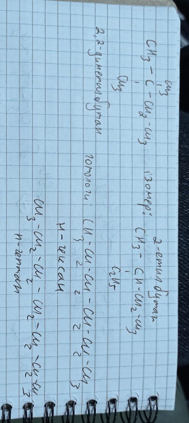 1. Для речовини, що має будову СН3-С(СН3)2-СН2-СН3, складіть формули одного ізомеру і двох гомологів.