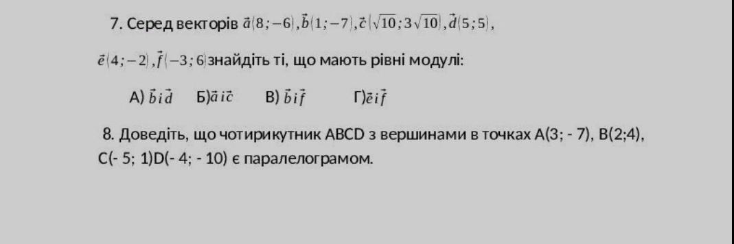 7. модуль |a|=√(aₓ²+a y²)=√(8²+(-6)²)=10; |c|=√((√10)²+(3(√10))²)=10; ⇒ |a|= |c|