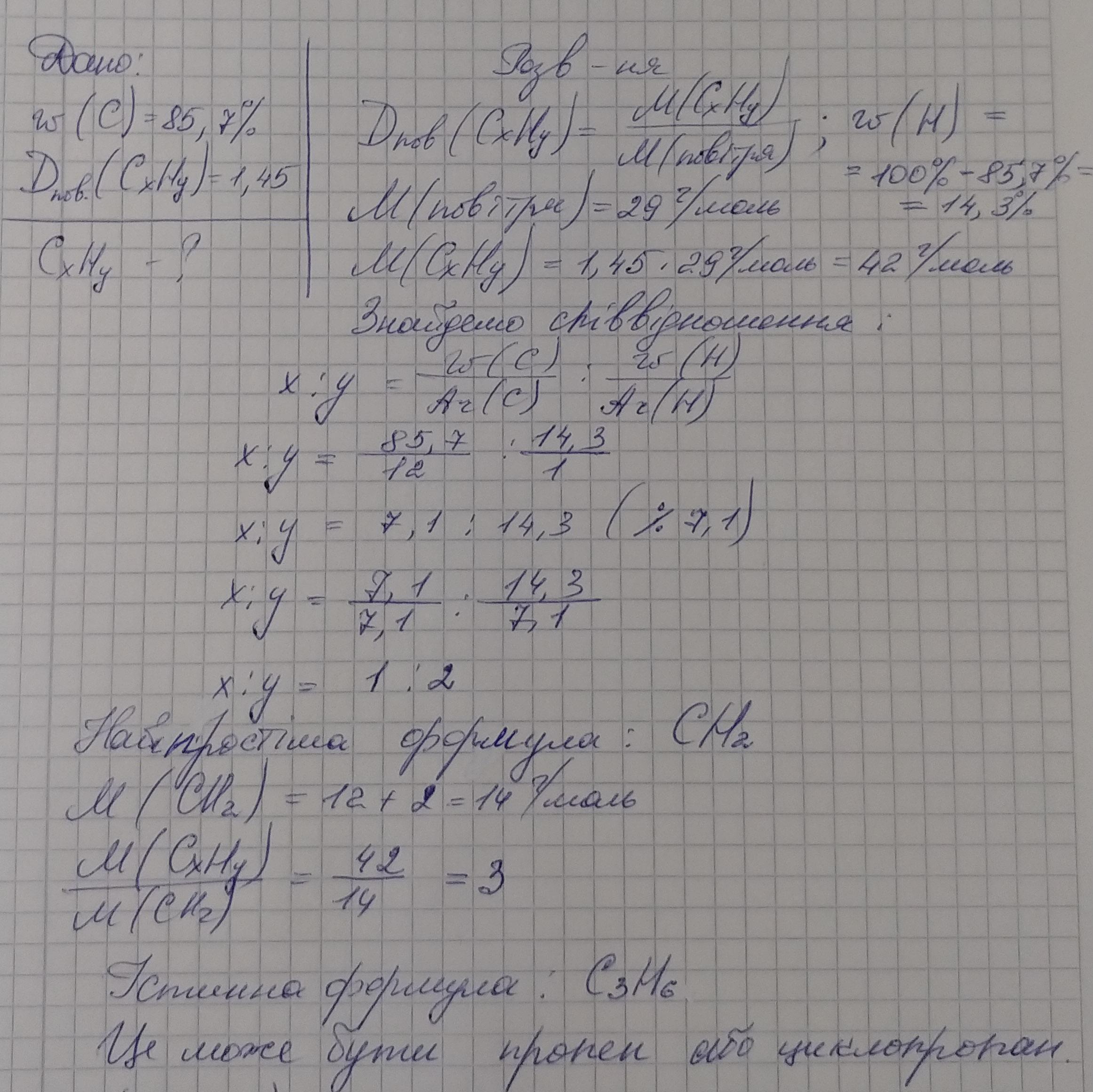 Масова частка Карбону у вуглеводні складає 85,7%. Густина парів вуглеводню за повітрям становить 1,931. Визначте формулу.