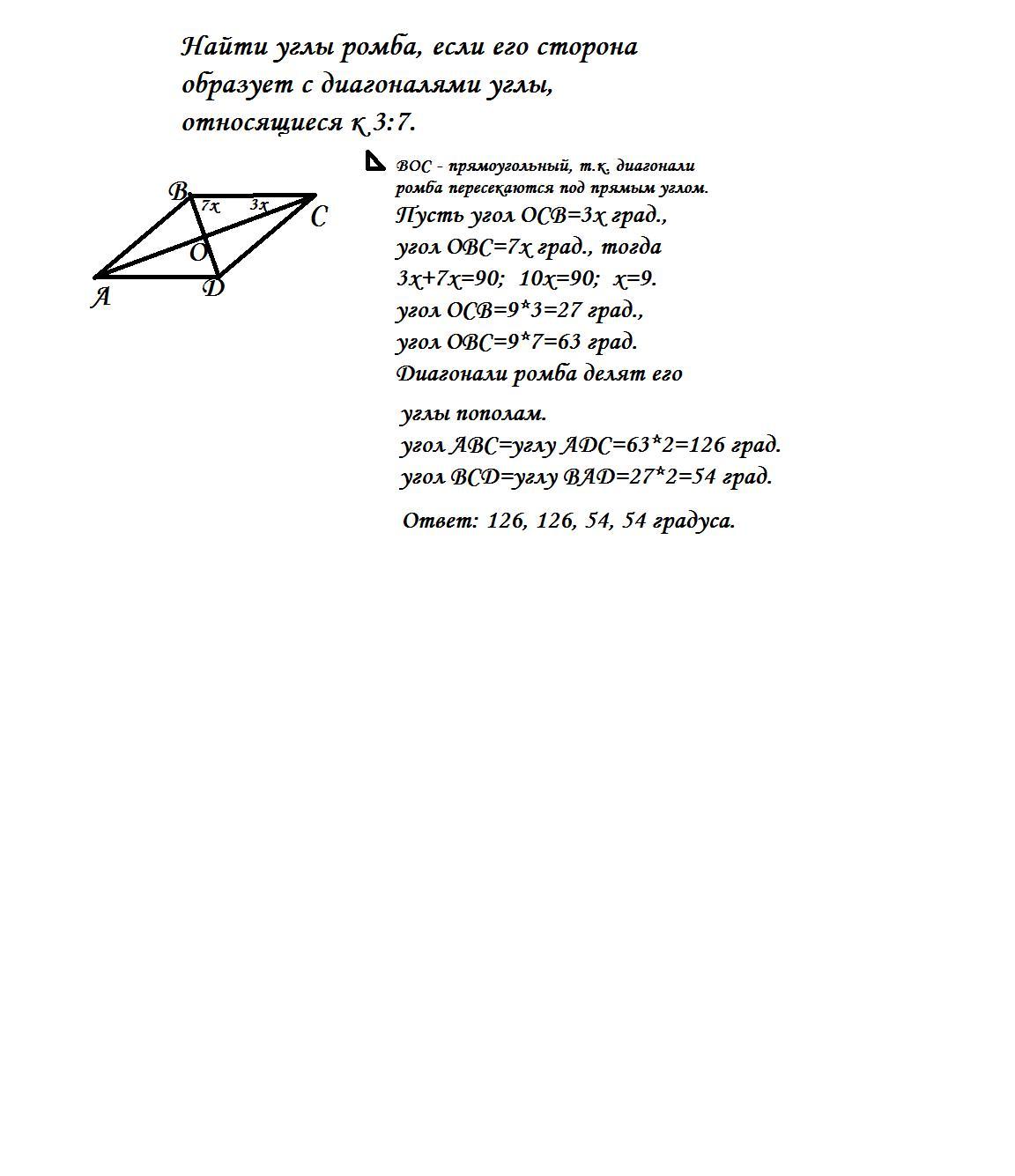 Найти углы ромба, если его сторона образует с диагоналями углы, относящиеся к 3:7. Решить на листочке. Прошу, у меня мало времени!