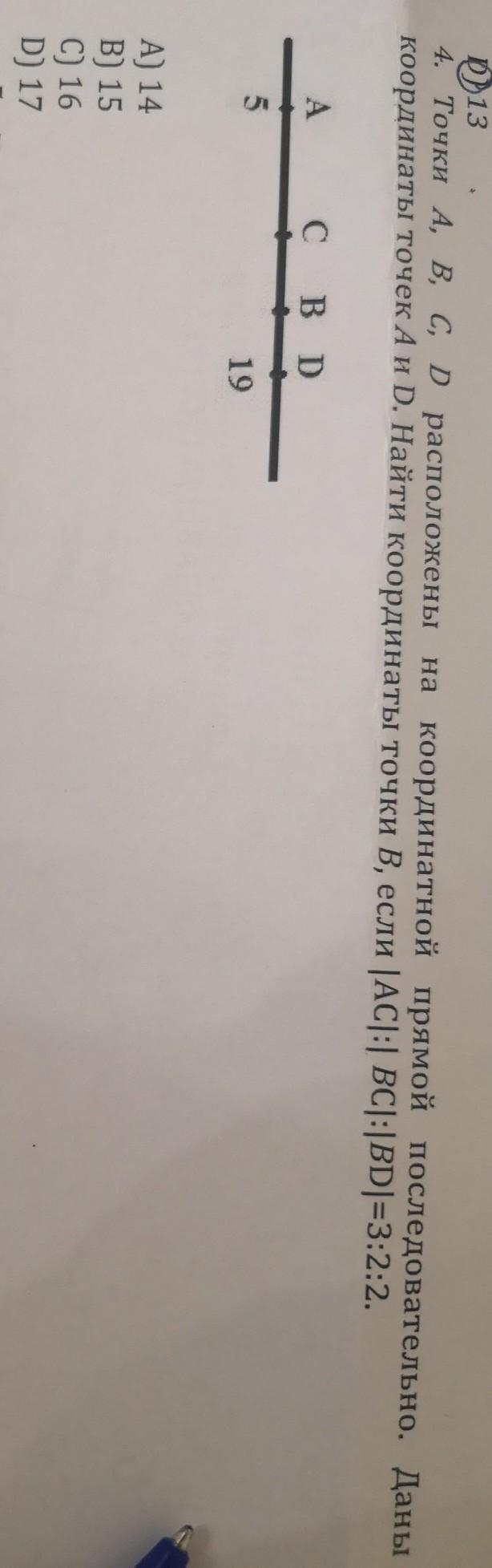 4. Точки А, B, C, D расположены на координатной прямой последовательно. Даны координаты точек А и D. Найти координаты точки В, если |AC|:| BC|:|BD|=3:2:2.