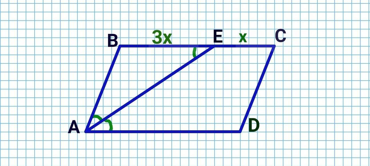 Дано: АВСD - параллелограмм, АЕ - биссектриса, AE∩BC=E. ∠BAE=∠DAE, BE>EC в 3 раза, ВС=12 см.