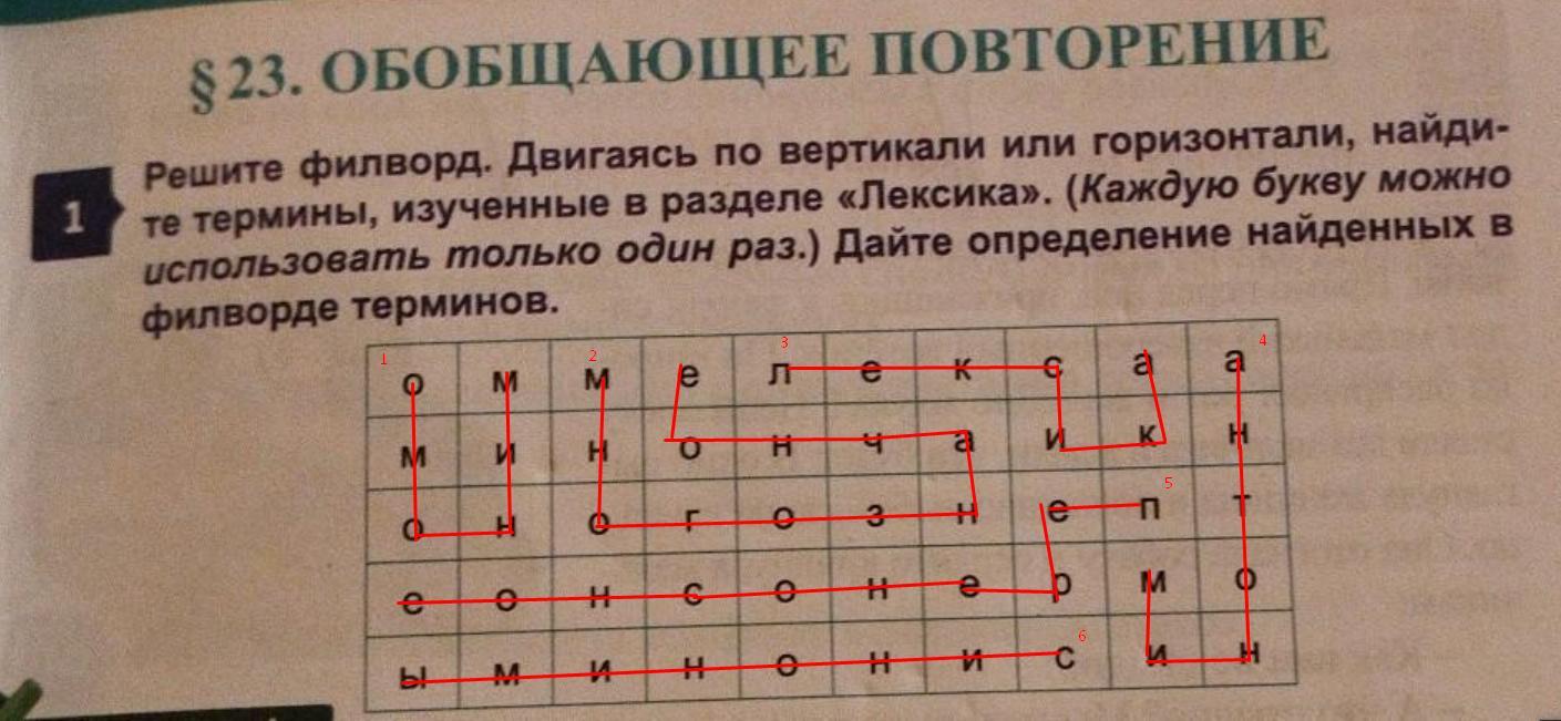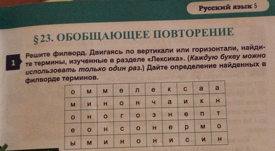 1 Решите филворд. Двигаясь по вертикали или горизонтали, найди- те термины, изученные в разделе «Лексика». (Каждую букву можно использовать только один раз.) Дайте определение найденных в филворде терминов.