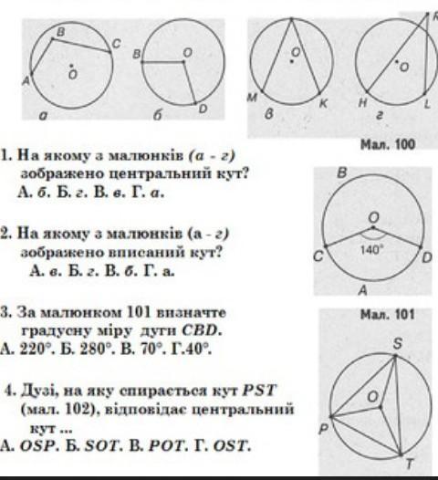 Ответ: 1 -А; 2 - В; 3 -А ( градусна міра кола - 360⁰, тоді дуга СВД=360⁰ - дуга САО = 360⁰ - 140⁰=220⁰. Відповідь: 220⁰); 4 -В