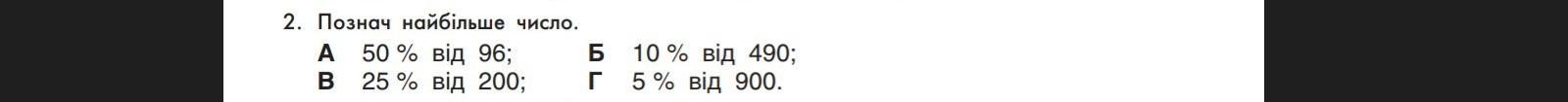 2. Познач найбільше число. А 50 % від 96; в 25% вiд 200; or ac Б Г 10% від 490; 5 % від 900.