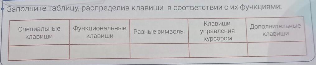 Заполните таблицу, распределив клавиши в соответствии с их функциями Специальные клавиши:....... Функциональные клавиши:......... Разные символы:...... клавиши управления курсом:........ Дополнительные клавиши:......