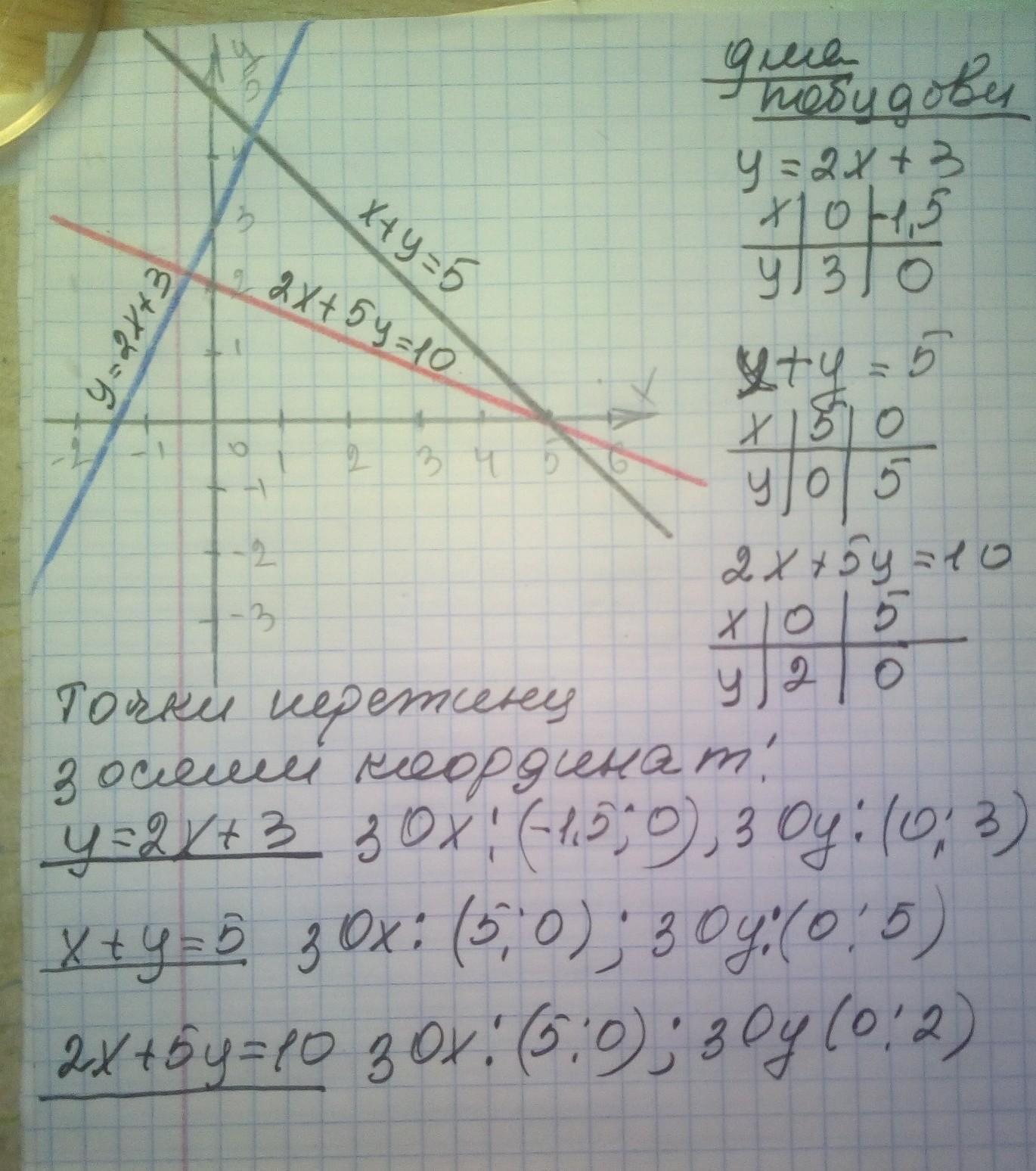 Побуйте прямі та знайдіть координати точок їх перетину з осями координат